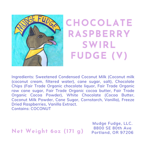 Semi-sweet chocolate swirled with raspberry fudge. Decadent. Developed in partnership with our Mudge Fudge logo artist, Leila, who proudly stated, " [It] tastes like the best black raspberry ice cream swirled with brownie batter." Try it for yourself and see!